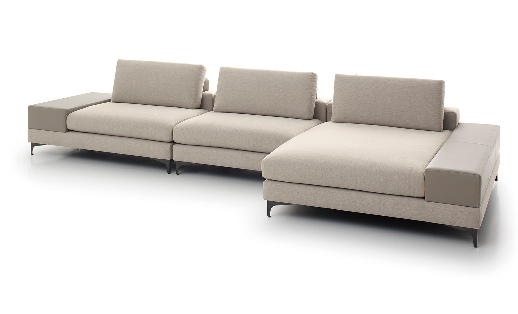 OBSERVAÇÃO: Para definir o lado da chaise, posicionar-se de frente para a peça. Opção de braços em tecido, courissimo, couro natural ou madeira laminada na cor carvalho e nogueira. Pés na cor grafite. Almofadas de encosto soltas.
